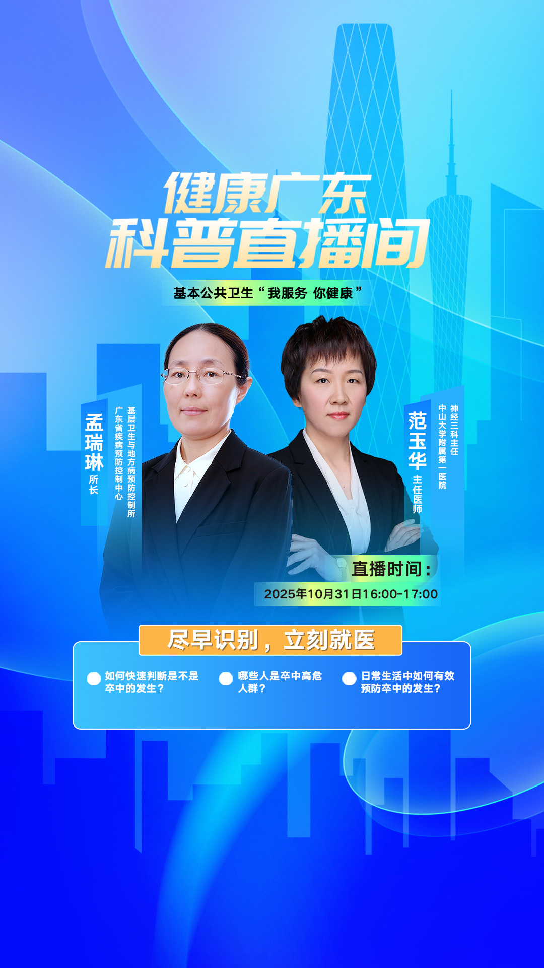 活动特邀广东省疾病预防控制中心基层卫生与地方病预防控制所所长孟瑞琳,中山大学附属第一医院神经三科主任、主任医师范玉华两位专家,结合临床与公共卫生视角,深入讲解卒中的早期识别方法、高危人群筛查与干预,以及日常预防策略,帮助公众深刻理解“时间就是生命”的急救理念,远离卒中威胁,欢迎准时观看!